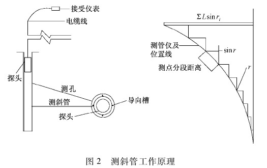 测斜仪可分为活动式和固定式两种,在基坑开挖支护监测中常用活动式测斜仪。活动式测斜仪主要由测头、测度仪、电缆和测斜管 4 部分组成。应用时先在土体中预埋测斜管,土体发生变形后,整个测斜管随之产生相应变形,通过测斜仪逐段测量倾斜角度,就可得到测斜管每段的水平位移增量,测斜管工作原理如图 2。