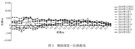 选取基坑北侧 03 号孔的监测数据,测斜深度—位移曲线如图 3 所示。