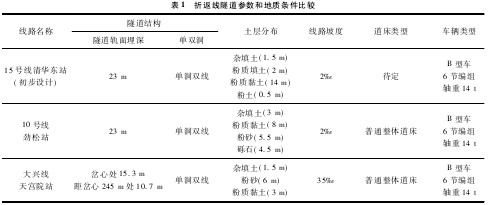 北京地铁 10 号线劲松站位于朝阳区东三环劲松桥南侧主路旁,其折返线隧道结构和地质条件与 15 号线清华东站折返线较为接近,但地面三环主路昼间交通流量较大,主要为小客车和公交车。大兴线天宫院站位于大兴区新源大街与天府路交汇处,车站南侧为地面车辆段,折返线埋深较浅,且存在延伸至地面的较大纵坡,但地面基本无公路交通,环境较为安静。两条折返线具体隧道参数和地质条件与 15 号线折返线的比较见表 1。