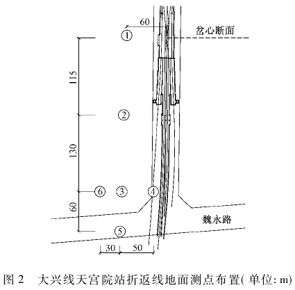 其中,断面③距折返线岔心纵向距离 245 m,横向距隧道壁约 55 m,相当于清华大学东配楼东南角距清华东站折返线岔心距离,为重要对比测点。