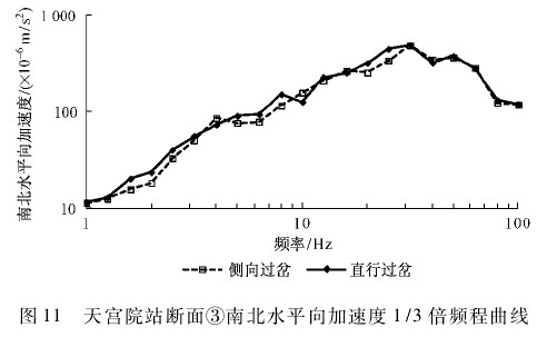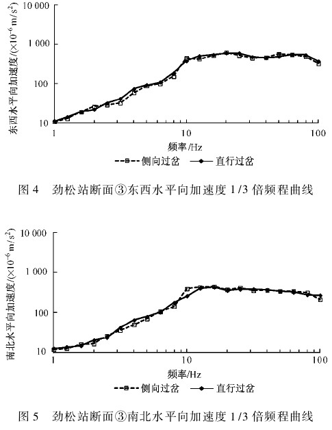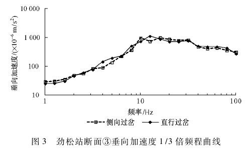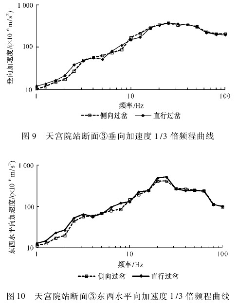 从图 9 ~ 图 11 三个方向实测结果可以看出,同一趟列车侧向过岔和直行过岔时,两者在断面③处的振动加速度 1/3 倍频程曲线很接近,中心频率 30 Hz 以上两者差异更小。