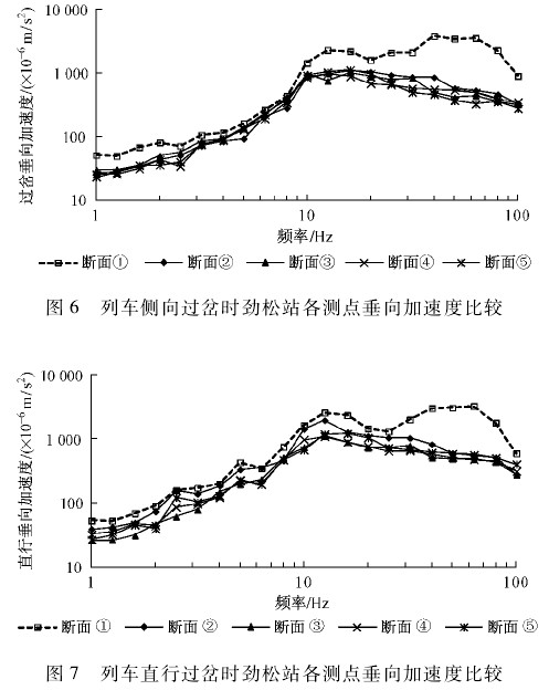 3) 断面①列车通过产生的高频振动明显; 断面②高频振动衰减很大,而中低频振动衰减相对较小; 断面③、断面⑤由于距岔心较远,列车已停车折返,过岔和制动产生的振动传递到这里时已大幅衰减,实测此处的振动水平接近地铁无过车时环境振动水平