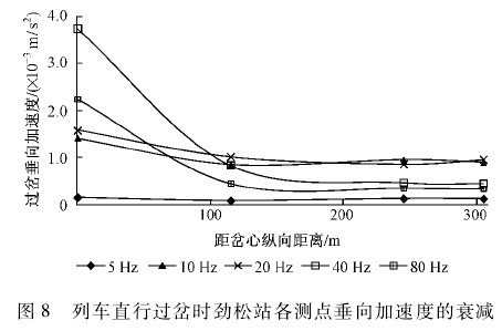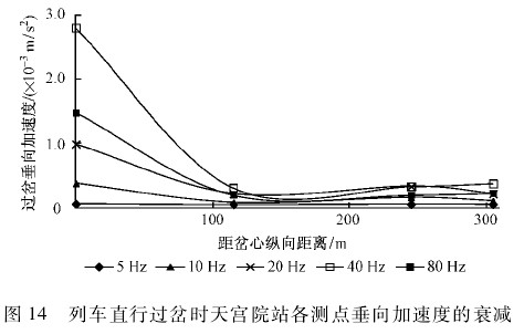 图 12、图 13 分别给出了列车侧向过岔、直行过岔时各断面测点垂向加速度 1/3 倍频程曲线衰减比较,并从中选取中心频率 5 Hz,10 Hz,20 Hz,40 Hz,80 Hz的垂向加速度值绘制随距离变化的衰减曲线,如图 14所示。其基本衰减规律与劲松站折返线分析结果相似,但在断面③附近振动略微增大,这主要有 3 点原因:
