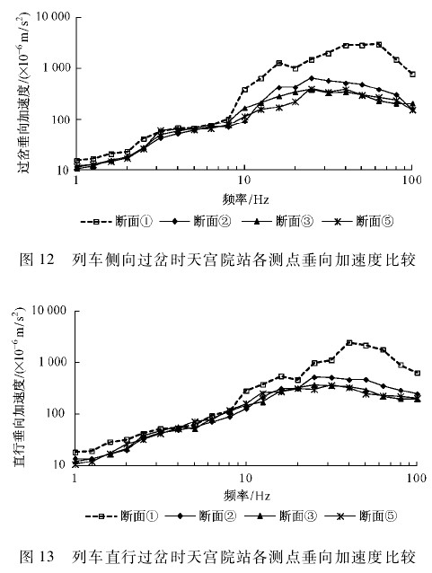 1) 劲松站折返线距岔心纵向距离 245 m 的断面③处地面垂向振动加速度主频为 4 ~ 23 Hz,东西水平向为 7 ~25 Hz,南北水平向为 5 ~ 25 Hz; 大兴线天宫院站折返线断面③处垂向振动加速度主频为 4 ~ 25Hz,东西水平向为 7 ~ 30 Hz,南北水平向为 7 ~ 33 Hz。