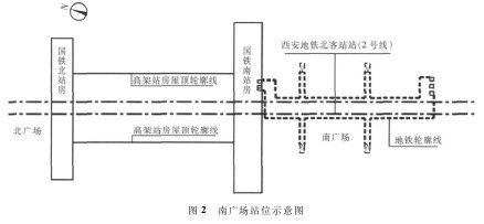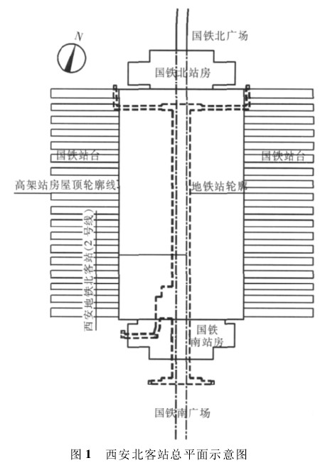 西安北客站位于西安市城区北部未央路、文景路,城市三环路及绕城高速公路交通枢纽衔接处。设一站三场 18 台 34 线,为国内大型的枢纽站之一。国铁站区南北分别设置站房及站前广场,形成“南主北辅”的格局,在南北广场规划布置公交、出租、大巴等各种交通设施停车场,长途客运站规划布设于南广场东侧,站场中部下方的南北联络通道长为 460 m。北客站是西安地铁 2 号线一期工程的起点站,2 号线北客站至会展中心段目前已开通运营。地铁线路呈南北走向,垂直穿过郑西客运专线铁路北客站站区,如图 1 所示。