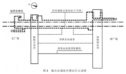 地铁北客站站与新建北客站同期设计,根据这个先决条件,西安市政府、西安地铁公司以“乘客至上”为目标,提出“无缝衔接”设计要求。设计之初,国铁站场为 10 台 18 线,地下通道长度 280 m,设南主北辅两个广场,由于车站长度和国铁站场长度匹配,经过多方案论证确定地铁站台位于通道下方作为实施方案,使得地铁与国铁、南北广场上各种交通设施换乘便捷,对南北广场客流吸引较好,很好地实现了设计要求。