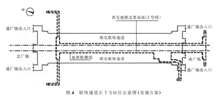 位于南北联络通道正下方站位优缺点: 国铁的出站人流可直接与地铁同层换乘,与国铁间基本实现了“无缝衔接”,使乘客换乘便捷。缺点是站台宽度受限,需做消防论证,附属风道过长不节能,设计施工协调量大,地铁管理不便,如图 4 所示。