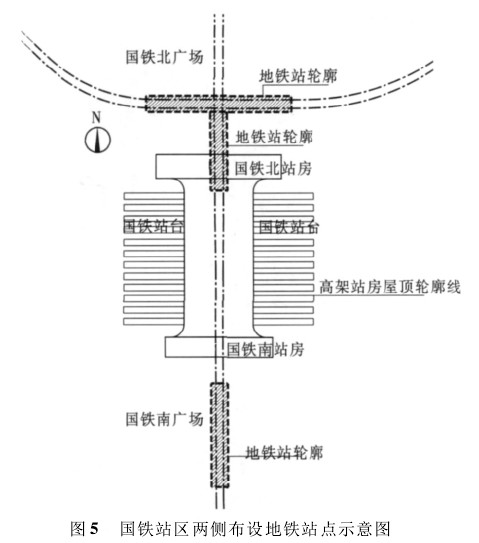 对于下穿国铁站场的轨道交通线路的站点设置主要有三种方式: 一是结合国铁出站通道层设计,二是位于主广场,三是在站区两侧广场均设置地铁站点。当站场区域小于 300 m,国铁只设置单侧站房和广场的情况下,建议地铁车站设于广场,乘客走行距离不长,满足换乘需求,也可避免国铁与地铁之间的协调管理矛盾; 如国铁在站场两侧均设置站房及广场,建议采用站台位于国铁出站通道层下方的站位方案,与国铁换乘便捷,与两侧广场的交通设施衔接较好,对两侧广场客流吸引均衡,附属风道可结合站房设计。如站场区域超过 400 m,若仅设置一个地铁站点,会造成乘客的步行距离较长,或导致运营设施不节能,不能完全满足对枢纽区域的服务功能。因此,建议在此种情况下,在站区两侧均设置地铁站点,站间距控制在 600 ~800 m左右,满足乘客步行舒适距离要求,同时使被站场割裂的两侧区域通过地铁串联起来。这样从功能上,扩大了客流吸引及枢纽服务范围,疏导客流有利; 在国铁与地铁间,不同地铁线之间、地铁与广场其他交通设施之间,均能高效便捷换乘,如图 5 所示。