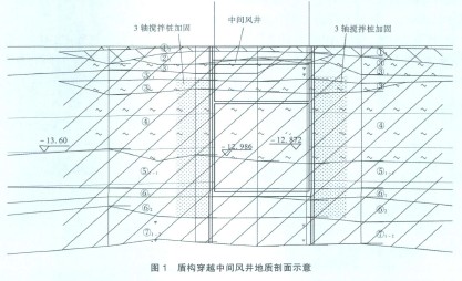本工程盾构穿越中间风井工程于 2011 年 5 月21 日做准备工作; 6 月 8 日,盾构进入中间风井; 6 月19 日盾构从中间风井出洞。