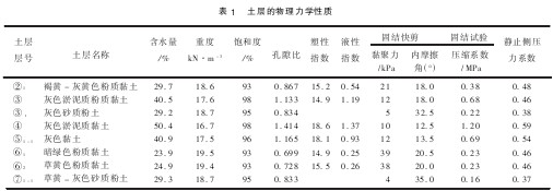 盾构机进、出洞所在土层主要为④灰色淤泥质黏土、⑤1 - 1灰色黏土; 上方土层包括: ③淤泥质粉质黏土、③t层砂质粉土; 下方土层为⑥1层粉质黏土。盾构穿越中间风井地质剖面见图 1。土层的物理力学性质见表 1。