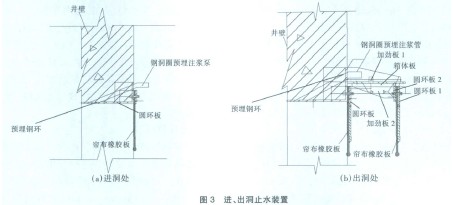 本工程同步注浆管为 6 点,置于盾构壳体外,距切口位置约 6. 3 m。当盾构壳体进入工作井约 6 m后,用钢丝绳将橡胶帘布板箍在盾构壳体圆周上,然后通过隧道内管片注浆孔进行压注水泥浆。待达到一定强度后,进行第 2 次进洞。