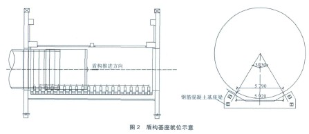 (1) 盾构基座。盾构机本体重( 约 1 200 t) ,因此盾构基座需要有足够的强度、刚度及整体稳定性。本工程采用 20 榀钢筋混凝土预制基座梁并加设斜坡钢箱梁和 Qu80 轨道。考虑到盾构机进洞后可能发生磕头现象,盾构就位后高程轴线比设计低 40 mm。