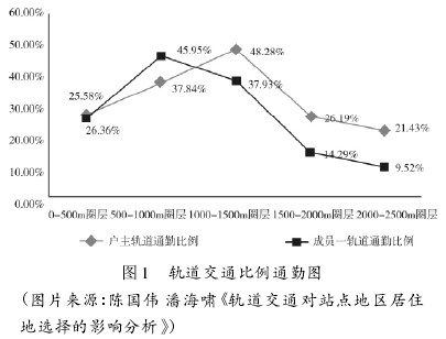 根据有关对上海梅陇和莘庄地区的调查,轨道交通的通勤比例与站点的距离呈现先增大后减小的关系。在 1 000 ~1 500 m 内轨道交通通勤比例最高,但在这个范围内并非离轨道交通站点的距离越近通勤比例越高,0 ~500 m 圈层轨道交通通勤比例均小于500 ~1 000 m 以及1 000 ~1 500 m 的通勤比例( 图 1) 。可见,最需要使用轨道交通的人群并没有住在离轨道交通站点最近,住在离轨道交通轨道站点最近的人群轨道交通通勤出行比例并不高。