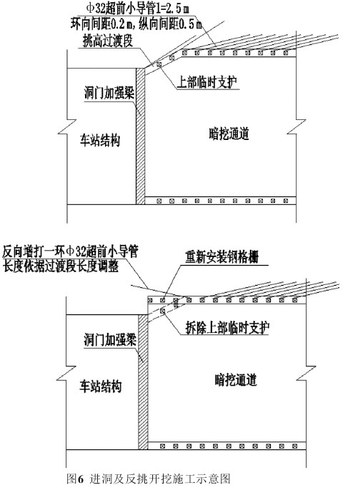 第一步:凿除洞门围护桩,以稍大于上挑段角度打设环向超前小导管,按CD法开挖,通过三榀隔栅间距挑高至暗挖通道开挖轮廓线,开挖过程中施工上部临时初期支护和下部永久初期支护。