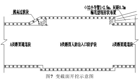 ②变截面开挖。出入口通道暗挖过程中存在小断面变大断面、大断面变小断面的情况各一处,其中A类断面与B类人防通道断面衔接处抬高0.7 m需要将小断面进尺缩短一定距离后,逐渐加大小断面尺寸,挑高过渡到大断面,挑高时仰角为30°~40°。B类人防通道断面与A类通道断面衔接处拱顶降低0.7 m,由于大断面变小断面产生错台宽度为0.7 m左右,错台形成的堵头墙需要梅花型@0.3 m布置Φ32水煤气管作为小导管,管长2.5 m,成辐射状打设并注浆,铺设钢筋网片并与锚杆端部点焊,喷射混凝土厚0.3 m(如图7所示)。