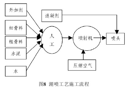 喷射砼为C20,厚度300 mm,喷射砼使用砼喷射机,潮喷工艺(见图8)。