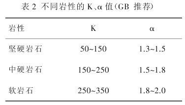 式中:Q———炸药量(kg),单段爆破炸药量;R———测点至爆源的距离(m);V———地震安全振动速度(cm/s);K———与爆破点地形、地质等条件有关的系数;α———衰减指数。K、α 值可通过试验爆破及振动观测直接得出或通过手头资料选取或工程类比确定。