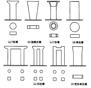 墩台基础除应有足够的强度和稳定性,避免在荷载作用下的过大位移外,其造型应能使上下部结构协调一致,轻巧美观,与城市环境和谐、匀称。墩台选型一般服从梁部形式,此外,也受占地、道路、通视等的限制。通常有:T 形墩、倒梯形墩、Y 形墩、单柱墩、双柱墩等基本形式及其变型(见图3) 。