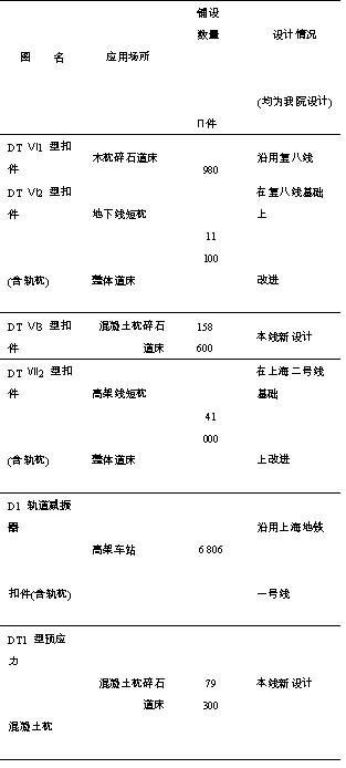 通过本工程在扣件设计方面的技术开发,使我院在北京地铁复八线项目中开发的DT Ⅵ 型扣件系列得到进一步完善和补充,并形成主要零部件可通用互换。分别用于木枕及预应力混凝土枕碎石道床、钢筋混凝土短枕式整体道床的扣件系列为DT Ⅵ1 型、DT Ⅵ3 型和DT Ⅵ2 型扣件系列。