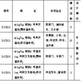 本工程采用60 kgΠm 钢轨9 号单开道岔及5 m 间距交叉渡线。在西直门、立水桥等站,道岔铺设于高架桥上;东直门站的道岔铺设于隧道内;回龙观等其余有岔站的道岔均铺设于地面线上。全线共设计道岔图四册,以适应不同线路铺设方式,见表2 。