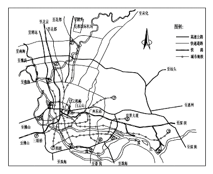 (5) 站、线和换乘站的布图1 广州市轨道交通规划示意图局应使旅客达到方便、快捷。