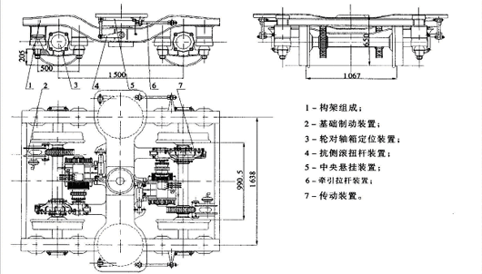 转向架的传动装置采用电传动的模式, 悬挂装置采用两系悬挂。其基本结构由焊接构架、摇枕、中央悬挂装置、轮对轴箱定位装置、动力装置及盘形基础制动装置等组成, 结构方案如图1 所示。