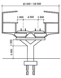 桥跨结构可选择的断面形式有箱梁、T 形梁、板梁和槽形梁等。箱梁截面抗扭刚度大,整体受力性能和动力稳定性好,正在规划的广州地铁2 号线高架车站拟采用这种形式。T 形梁刚度大,材料用量省,还可采用预制吊装法施工,宜优先采用。