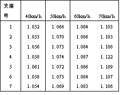 表1 是7 个支座冲击系数的比较。可以看出,随着速度的增加,各支座的动力系数相应增大;相同速度下各支座动力系数相差不大,但中间支座动力系数大于边支座。