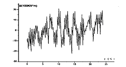 图6 和图7 为第一支座下节点的横向弯矩和纵向弯矩时程图(把垂直列车行进方向定为横向,沿着列车行进方向定为纵向) 。各节点的内力时间历程曲线形状基本相似。随着车速的增加,各点内力的峰值相应增大,表明冲击系数增大。节点横向弯矩要远小于纵向弯矩,纵向弯矩和轴力成为内力分析中的控制因素。