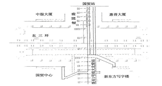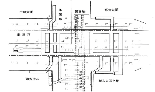 国贸站位于东三环中路与建设国门外大街的交叉路口, 路口为三层互通国贸立交桥, 周边建筑主要有国贸中心、中服大厦、惠普大厦、新东方写字楼等。车站主体与东三环中路走向一致。既有1 号线地铁大北窑站在建国门外大街之下, 为地下三层车站。本站是与1 号线地铁大北窑站的换乘站, 本站站位及埋深主要受1 号线地铁大北窑站区间的控制。