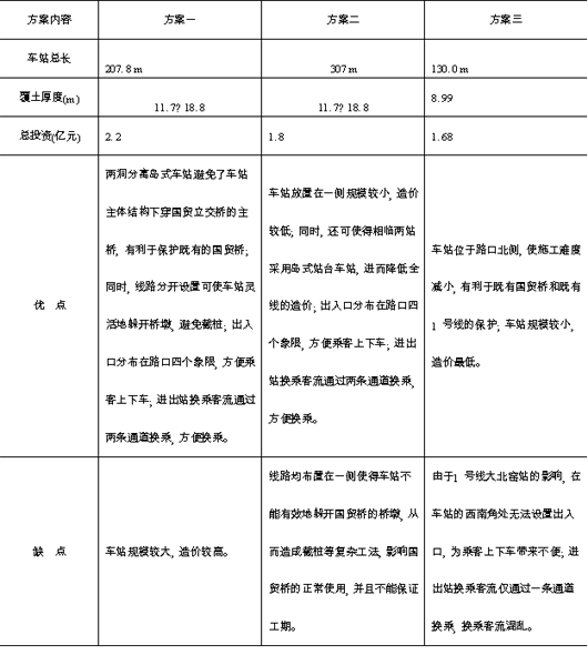 车站位于东三环路和建国路交口的北侧, 站中心里程为D K 21+ 664. 962, 单跨双层三洞分离岛式车站, 与1 号线大北窑站基本成L 型交叉, 与地铁1 号线之间的换乘为站厅与站厅之间的通道换乘。三个方案的比较见表1。经综合分析比较, 建议方案一为推荐方案。