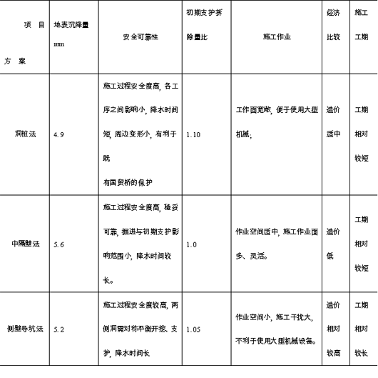 通过表2 比较可知, 洞桩法具有地面沉降量小、工期短、结构安全度高、造价适中的优点, 同时降水时间最短, 降水引起的沉降最小, 并可在洞内降水。该点对1 号线地铁车站和既有国贸桥的保护非常有力, 因此双层段车站采用洞桩法施工。下穿既有1 号线区间的单层段, 由于受1 号线大北窑站和密集的国贸桥桩基的影响, 无法采用洞桩法施工而采用中隔壁法施工。