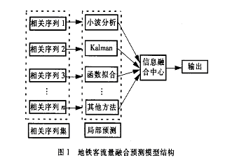 由于预测对象的复杂性,为了表现与预测对象相关联的其他对象或属性,每个关联对象(属性) 用一个时间序列来表示,作为预测对象的相关序列。所有用于预测的相关序列构成预测对象的相关序列集。由于在预测中具有不同的作用,各相关序列将使用不同的处理和预测方法。在相关序列集上的地铁客流量融合预测模型结构,如图1 所示。