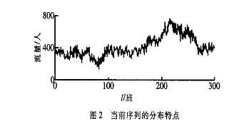 该序列数据的主要影响因素是时刻,同时还受人为、气温、天气等其他扰动因素的影响,数据分布的非线性特性较大,频带较宽。第l 班列车的流量如图2 所示。