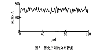 历史序列 同为工作日或同为节假日的相邻数天,其流量曲线形状相对类似,流量曲线相似的日期在预测中具有较大的参考意义。本站最近m 天在时刻t 的流量按日期先后记录下来的数据构成的时间序列为历史序列,即f2 (t) = { F0 i-p(t) ,1 ≤ p ≤ m} ( 3 ) 工作日和节假日流量差别较大,可将它们分类处理。该序列整体分布较平稳,有震荡,但频带较窄。第p个工作日在时刻t的流量如图3 所示。