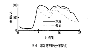 广州市地铁某站一个方向的流量数据是以每班列车到站上车的人数记录的(流量单位:人/班) 。根据2002 年5 月1 日 2003 年3 月2 日的流量数据,运用本文算法进行预测。按照1.2 节的方法构造了4 个相关序列:当前序列f1 (t) 、历史序列f2 (t)以及相邻2 个车站的邻站序列f3 (t)和f4 (t) 。