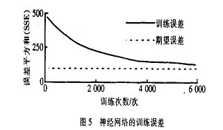 将网络的训练标准SSE 设为64(60 组训练样本), 利用上述样本对神经网络进行训练,训练6 000 次时网络的权值和阈值将达到最佳值,即达到了训练目标。神经网络训练目标接近过程,如图5 所示。