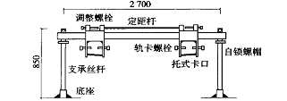 整个支撑架可分为两层,上层为两调整螺栓及定距杆,调整轨道时两螺栓一松一紧带动定距杆实现钢轨的水平位移,对轨道起粗调的作用。下层为连接定距杆的拖式卡口,每个卡口的两轨卡螺栓可调整钢轨的水平位移,还可以实现对轨距的少量调整,完成对轨道的精调。钢轨由插板托起,在丝杆的作用下实现高度的变化。