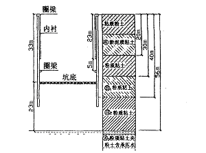 地铁要求保持空气流通以保护群众和保证系统的安全。风井是地铁的一个重要组成部分。地铁的风井结构既有矩形基坑,也有圆形基坑。目前,上海地区基坑工程的设计均以长条形基坑为基础[1 ] ,把基坑当作一个平面应变问题来研究。为了保证基坑底部的稳定,其入土系数通常取为0. 6~ 1. 0[2 ] ,设计方法通常采用经验法、有限元和模型试验相结合。对于圆形基坑,其围护结构的受力比长条形基坑有利,具有明显的空间效应,但地下连续墙合理入土深度的选取还未见之于规范。根据上海迄今为止的工程实践表明,圆形基坑的入土系数可以在0. 2~0. 7 之间变化,但尚缺乏成熟的计算方法。本文以某圆形基坑为例,通过离心模型试验对不同入土系数时圆形基坑开挖的稳定性进行研究。