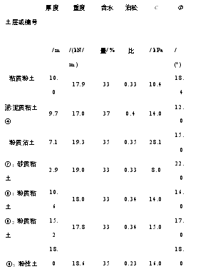 某工程基坑为圆形结构,外径29 m , 基坑的开挖深度为33 m ; 采用地下连续墙作为围护结构,初步设计深度为53 m , 厚1 m , 内衬厚0. 6 m , 圈梁截面尺寸1 m ×2 m 。坑底下面有一承压水层,是地层编号分别为⑧3 、⑨1 、⑨2 的粉性土、粉细砂和中粗砂,埋深56. 0 m 以下,其水头高出含水层顶板( ⑧2 层底面)46. 8 m 左右,水头较高,是坑底产生失稳的隐患。基坑剖面图如图1 所示,土层物理力学指标列于表1 。