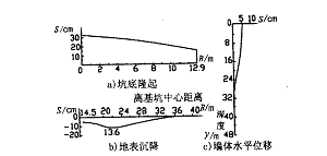 坑底隆起的最大值位于坑底中间,最小值为坑边,坑底隆起曲线呈抛物线型。坑外地表沉降曲线为凹型,沉降最大值发生在远离连续墙5~8 m 的地方;地表沉降影响范围约20 m 左右,为开挖深度的0. 5 ~ 0. 7 倍。而对于长条形基坑, 按经验估计[ 2 ] ,地表沉降影响范围为开挖深度的1. 5~2. 0 倍。连续墙的位移较小,最大位移发生在接近地表处,这是因为圆形墙体具有较强的结构空间性,宜于承受开挖引起的侧压力荷载。