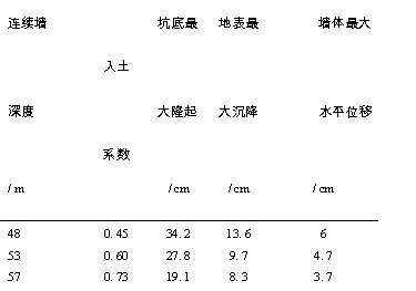 从试验数据看,随着入土深度的变大,基坑位移变小。对于一般基坑,允许隆起量[δ]可取为H (开挖深度) 的1 %[ 3 ] 。连续墙深57 m 和53 m 时, 基坑隆起均小于允许值,基坑是稳定的;连续墙深48 m 时,基坑隆起值只比允许值大3. 6 % , 可当作稳定情况。由此可见,入土系数为0. 45~0. 73 时, 基坑是稳定的。