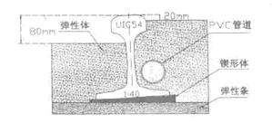 传统的轨道结构,其钢轨和轨枕(或整体道床) 是通过扣件连接的,钢轨的支撑和固定都是离散的,钢轨完全暴露在空气中。嵌入式轨道结构则采用连续的固定和支撑方式,其基本做法是:用一种叫Corklast 的弹性体将钢轨固定在钢筋混凝土板整体道床的凹槽内,整个钢轨几乎完全埋置在弹性体中,除了必要的信号电缆和牵引供电电缆外,在钢轨和混凝土之间以及两条钢轨之间没有任何的机械联结(图1) 。嵌入式轨道结构具有以下优于传统非连续支承轨道结构的优点: ① 减小了轨道结构的厚度,厚度只有200 mm ; ② 不仅在设计上有很大的自由度,而且由于钢轨是连续支撑的,减少了钢轨疲劳的发生; ③ 不需要轨距拉杆、混凝土轨枕和钢轨联结部件; ④ 由于周围的线路路基可以和钢轨面齐平,对平交道口和库内工作很理想; ⑤ 具有良好的减振降噪性能和少养护维修的特点。