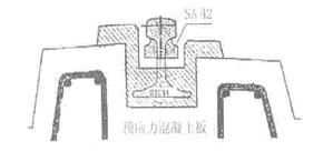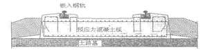 嵌入式钢轨的调整定位是一项复杂精密的工作,而且钢轨定位以后就不能做横向和竖向调整。因此,对其下部基础提出了严格的要求。一般来说,有以下两种类型的下部基础适合于嵌入式轨道结构: ① 混凝土板式道床,这是最典型的嵌入式轨道结构,道床采用预应力加强混凝土板,沿线路的纵向和横向分别施加了比例高达1. 5 % 的预应力。这种类型的轨道结构在荷兰的铁路干线和轻轨线路上,尤其在桥梁和平交线路上,都有很大程度的使用,其结构如图3 所示。② 采用箱型梁作为下部基础。在这种轨道结构中,箱型梁直接放在土路基上,路基的沟槽形状和梁体相吻合;整个梁的重量不大于挖出的土体的重量,这样梁下的土体不会发生大的沉降和变形(图4) 。箱梁具有和桥梁相当的挠曲刚度,能够保证轨道结构正确的几何形位, 因此非常适合于嵌入式轨道结构。