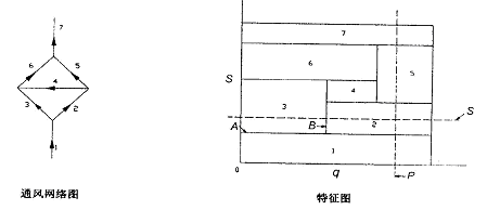 特征图作为一种网络技术是运筹学的一个重要分支。只要能形成系统,能用图G(E,V ,σ) 表示的,均可用特征图表示[1 ]。G代表对应通风系统的网络图,V 是图G的节点集合,V = { v1 ,v2 , ⋯, vm} , 其中m 为节点的个数; E 是网络中所有分支的集合, E = {e1 ,e2 , ⋯,en} , 其中n 为分支的数目;σ是节点vi 与边ej 之间的连接关系。风网特征图也叫压能图、平衡图,就是通风网路中的每一条边用矩形框来表示,并按一定的关联关系排列在图上;在同一比例下,矩形块的宽等于该边的风量,高等于该边的风压,矩形面积等于该边的通风消耗的功耗。