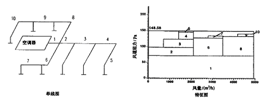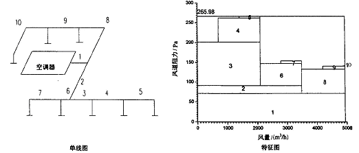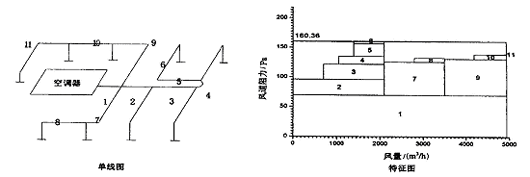 图4 方案3 系统的单线图和特征图具有静压箱作用的主风道,测得各部分阻力分配均