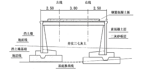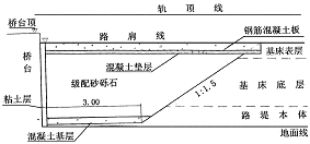 本线有两段曲线一部分位于高架桥上另一部分属于地面线,高架桥上采用的是整体道床。为使整个曲线范围内的轨道形式统一,同时为了便于今后的养护维修,该段曲线的地面线部分亦做成整体道床。与碎石道床不同,在地面线做整体道床需要对道床以下直至基底范围内进行特殊处理,以满足整体道床对其下基础的强度及刚度要求。