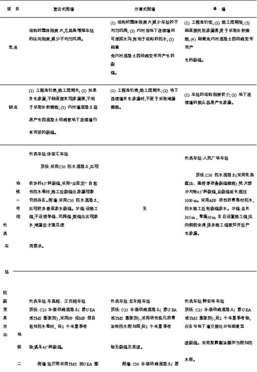 现在地铁车站的侧墙结构形式主要有3 种:复合式侧墙、分离式侧墙和单墙。在地铁一、二号线中,大部分车站采用的是复合式侧墙结构形式,采用分离式侧墙和单墙的结构形式还比较少,只是在个别车站试用。对这3 种结构形式的侧墙代表车站的调查表明,复合式侧墙存在着比较大的问题。表1 为这3 种结构形式侧墙的优缺点比较。
