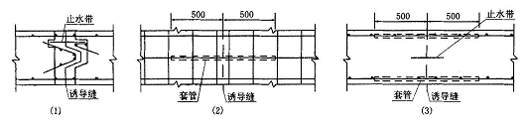 在地铁一号线的部分车站和二号线车站中合理设置了诱导缝,将较长的车站结构分为相对较短的结构段,诱导缝成为结构的薄弱环节,使得裂缝主要在该处形成,从而增强了整个结构适应变形的能力;而结构中因温差、混凝土收缩等因素产生的内约束应力也得到有效的释放,因此结构中的裂缝得以减少。例如在一号线的新闸路、汉中路及二号线的所有车站设置诱导缝后,抗裂防渗效果显著,在车站顶板、侧墙结构中裂缝、渗水现象明显减少。