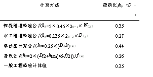 关于车站的埋深问题曾有几种意见。最初的意见认为,埋深应使车站拱顶的岩石厚度在扣除人工填土和强风化层后,满足一倍的开挖洞径(即覆跨比hp/D =1)才是安全的。但这样将使车站埋得很深,给使用带来不便。为此,同济大学对青岛地铁的埋深曾进行过专题研究,其结论认为车站的覆跨比可由1 减为0.5,使得车站埋深大大减少了。具体设计时,笔者注意到了专题研究的成果,但没有简单地照搬。我们认为暗挖车站安全而又经济的埋深应该是使其满足深埋条件的最低限,使车站埋深在保障安全的前提下达到最浅。因此,确定深埋条件的最低限,就成了确定车站合理埋深的关键。在确定这个限值时,为确保结论的可靠性,笔者采用了多种计算方法并参考了一般工程经验。满足深埋条件的覆跨比计算结果见表1。